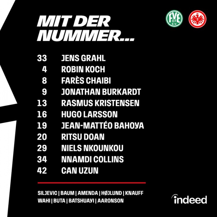 法兰克福首发:33-格拉尔、4-科赫、8-查伊比、9-布尔卡特、13-拉斯穆斯-克里斯滕森、16-雨果-拉尔森、19-巴霍亚、20-堂安律、29-恩库恩库、34-纳姆迪-科林斯、42-乌尊